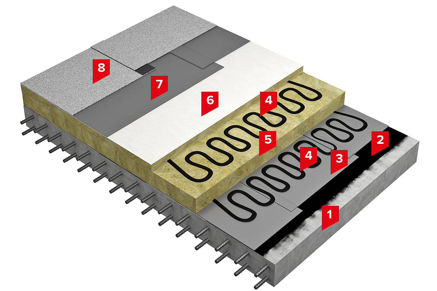 Система неэксплуатируемой крыши по железобетонному основанию с клеевым методом крепления теплоизоляционных плит и устройством наплавляемой двухслойной кровли