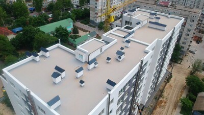 Система устройства эксплуатируемой крыши под пешеходную нагрузку с дренажной мембраной.