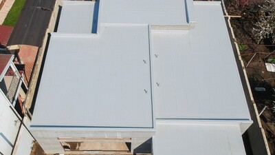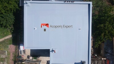 Sistem de acoperiș neexploatabil pe platelaj din beton armat cu metoda de fixare prin încleiere de plăci PIR termoizolante și amenajării acoperișului bistrat bitum-polimer.
