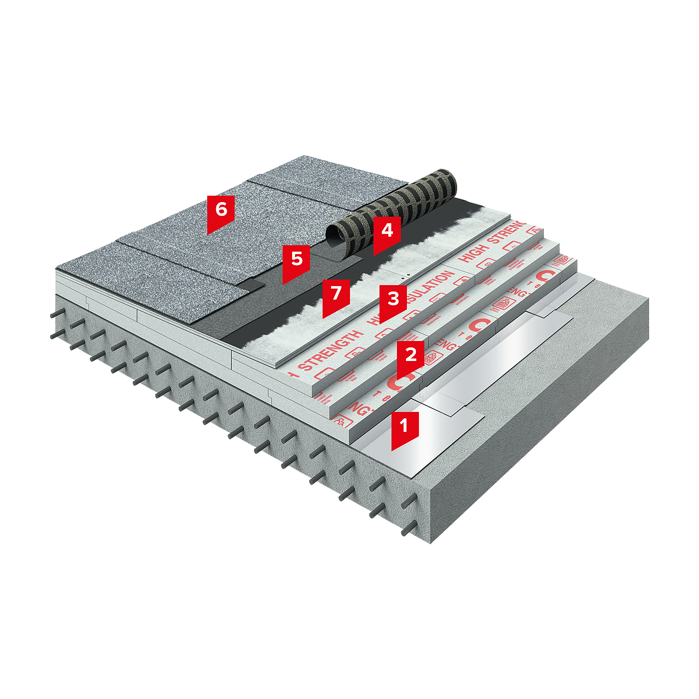 Sistem acoperișului neexploatabil pe platelaj din beton cu șapa prefabricată din contrapantă din polistiren extrudat.